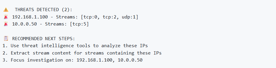 NetForensicMCP is designed to give LLMs the ability to perform advanced offline network traffic analysis, converting packet capture files (PCAPs) into actionable threat intelligence. It also enables security professionals to hunt threats, respond to incidents, audit compliance, investigate attacks, and extract indicators of compromise (IoCs) using the following tools that are accessible within the server: